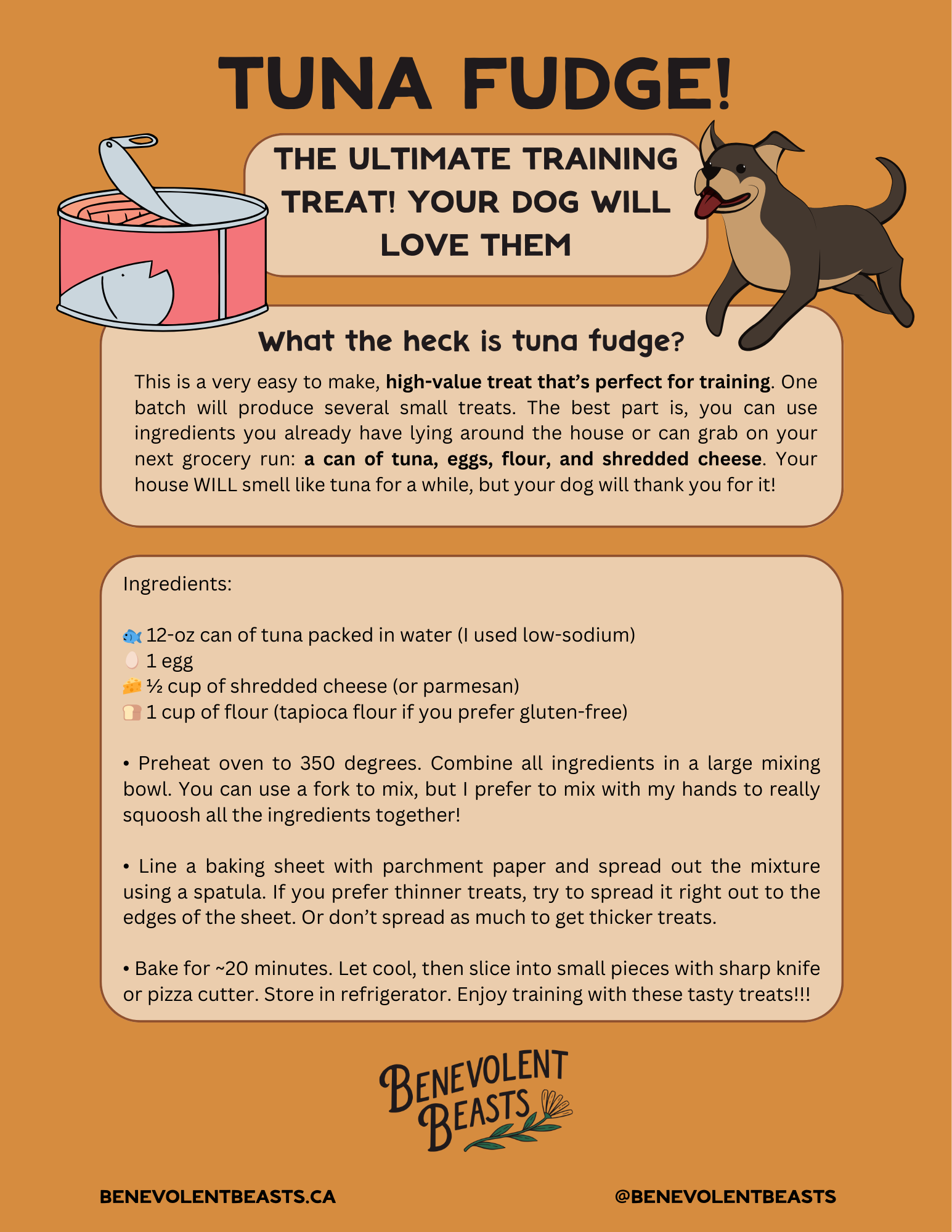 Fill out the form below and I’ll send you a free PDF with a recipe for tuna fudge, my favourite dog training treat. It’s so easy to make with just four ingredients.